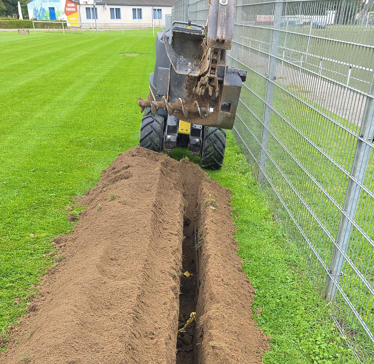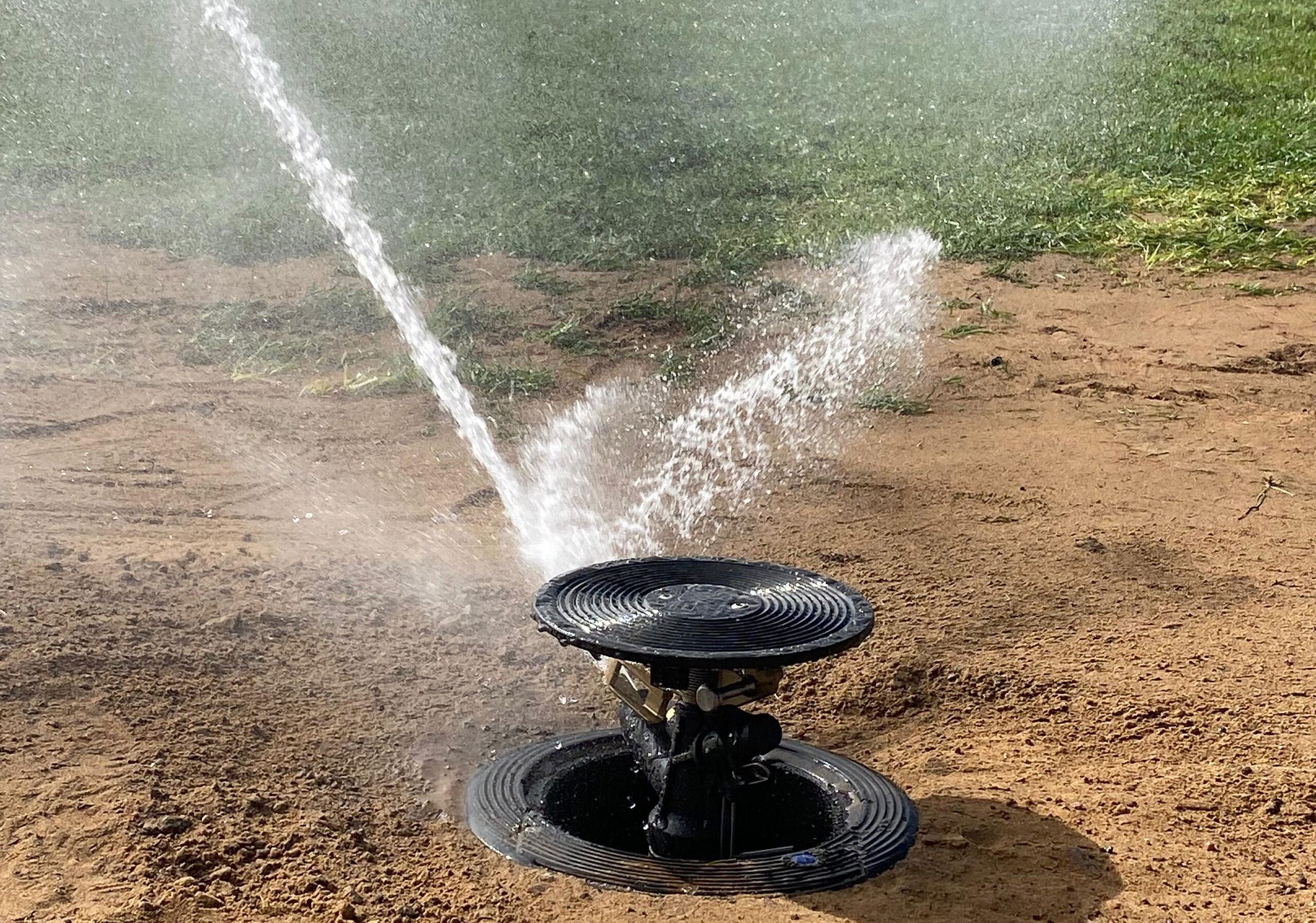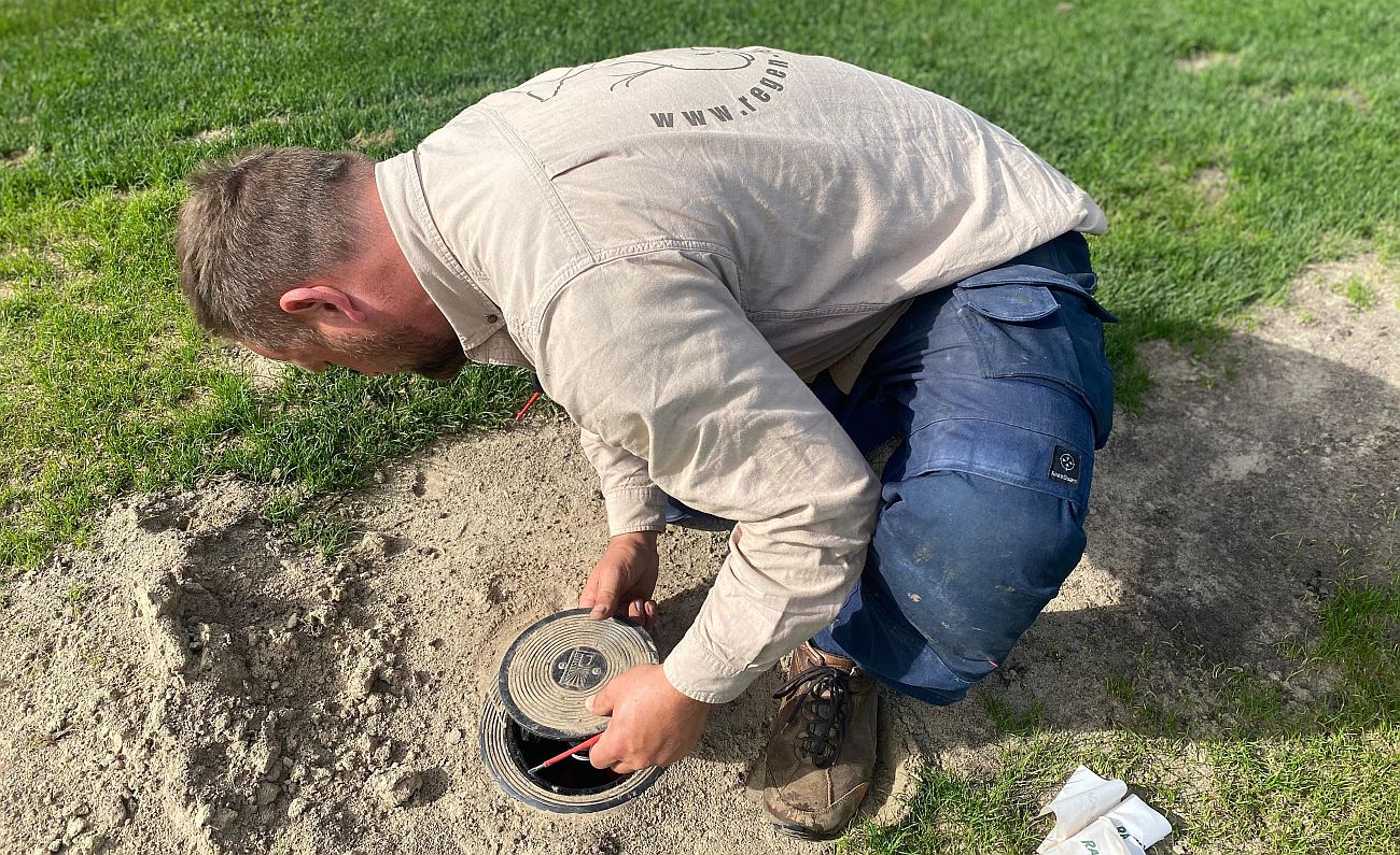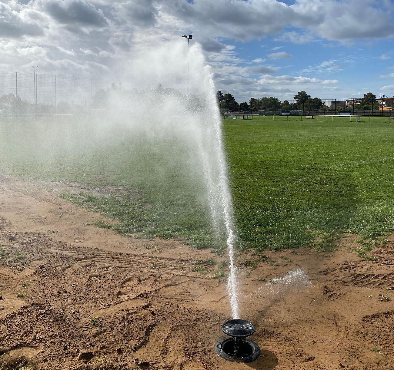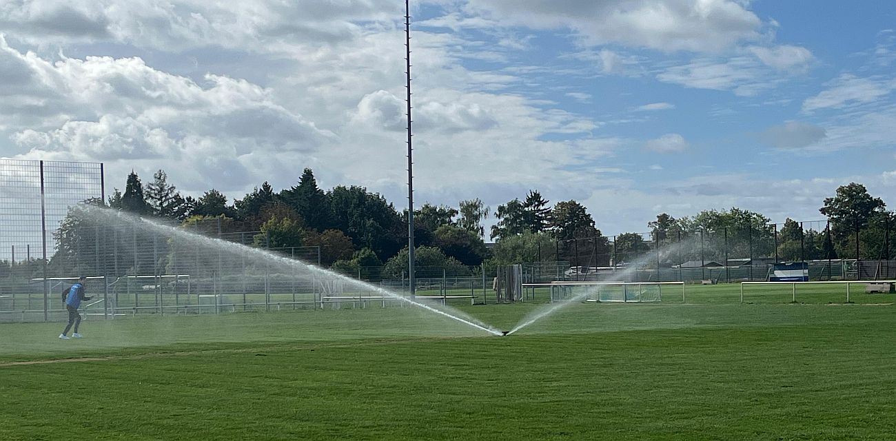 Nach anderthalb Wochen intensiver Arbeit ist es geschafft: Heute konnte im Werner-Seelenbinder-Stadion die neue Beregnungsanlage in Betrieb genommen werden. Pünktlich zur Mittagszeit, bei bestem Sonnenschein, liefen die ersten Regner.