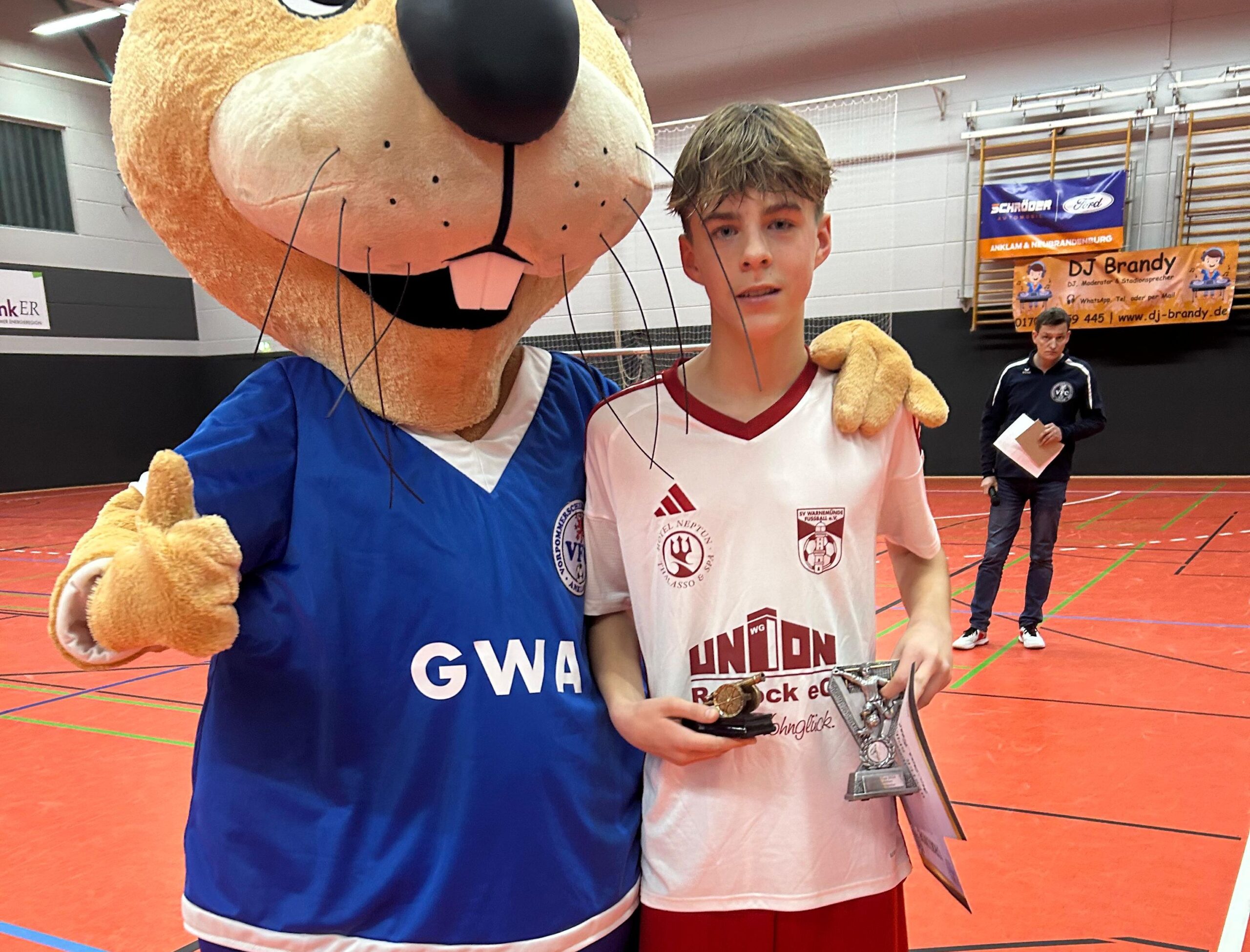 Bei der Siegerehrung durfte sich Ben-Lares Frost (SV Warnemünde) über gleich zwei Auszeichnungen freuen: Er wurde als bester Spieler und bester Torschütze geehrt. Den Pokal für den besten Torhüter erhielt sich Gino Wiedemann aus unserem zweiten Team.