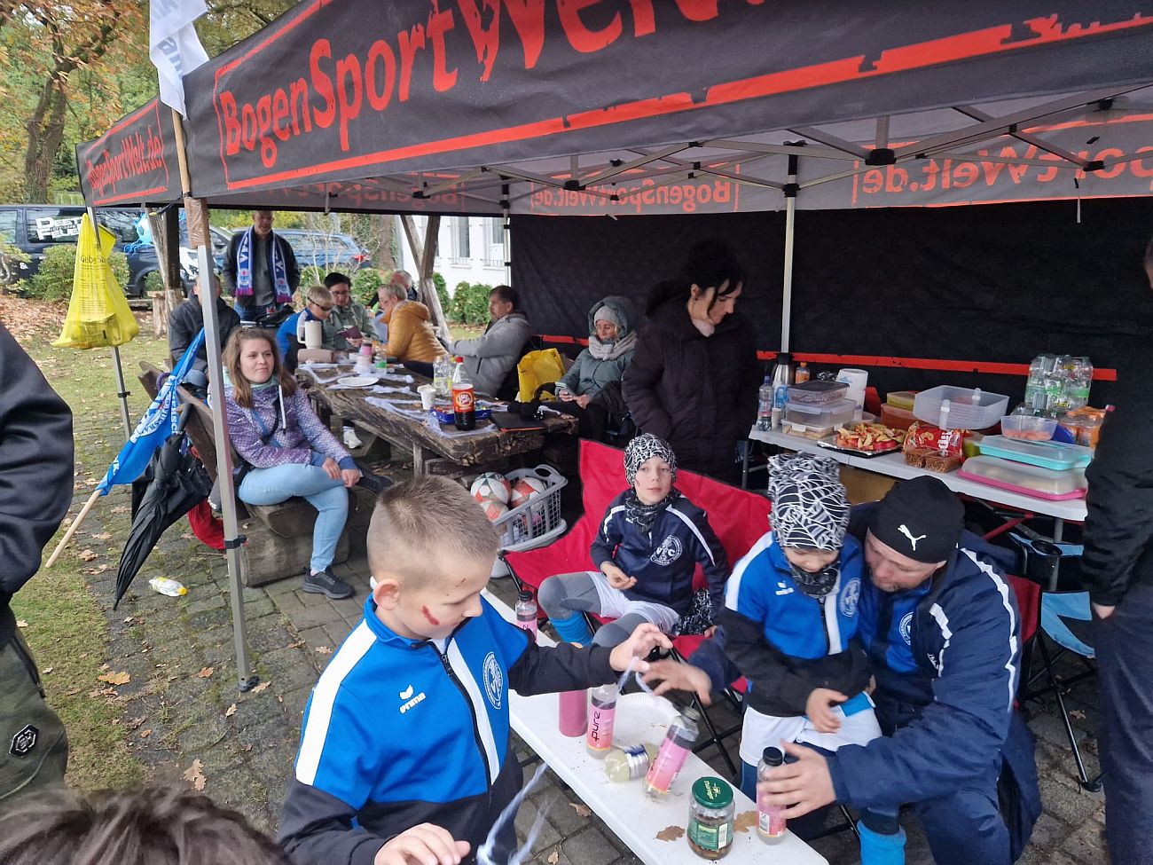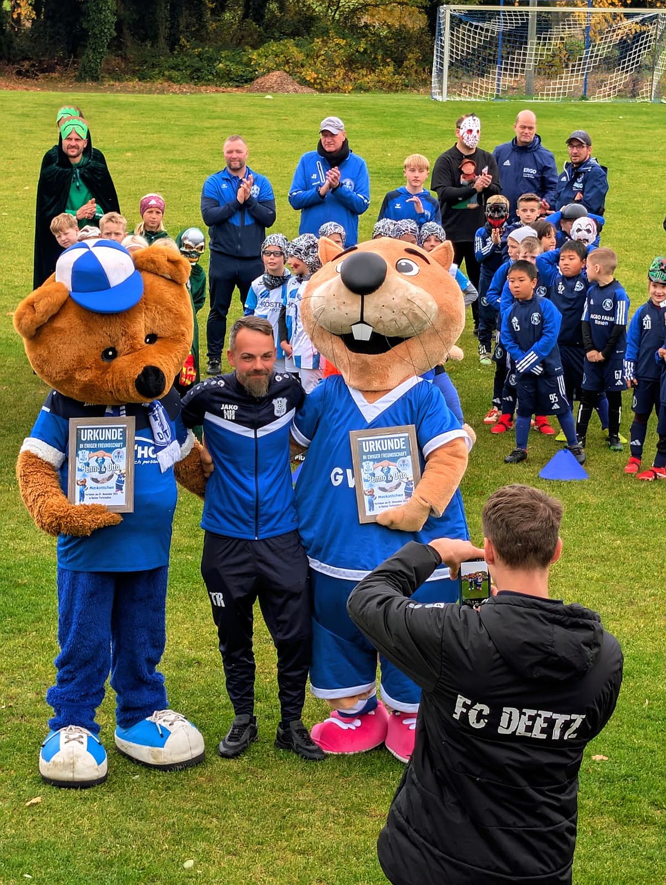 Dank unseres großzügigen Sponsors Köster’s Apotheken, Inhaber Florian Köster, konnten unsere Jungs einheitlich geschminkt und mit Mützen und Schals ausgestattet in ihr gespenstisch-schönes Outfit schlüpfen – bereit, jeden Gegner das Fürchten zu lehren. Auch an gesunder Verpflegung mangelte es nicht: die Eltern sorgten mit liebevoll vorbereiteten Snacks dafür, dass niemandem die Energie ausging – Vitaminpower statt Zucker-Schock! Nach einer rund dreistündigen Fahrt erreichte der Bus gegen 13 Uhr den Austragungsort. „Die Stimmung dort war großartig“, so Nachwuchs-Trainer Jan Schiller. Und spätestens, als die beiden Maskottchen Benno und Otto feierlich die Vereinsfreundschaft zwischen dem FC Deetz und unserem Club verkündeten, war klar: Hier ging es um mehr als nur Fußball – hier zählte Gemeinschaft.