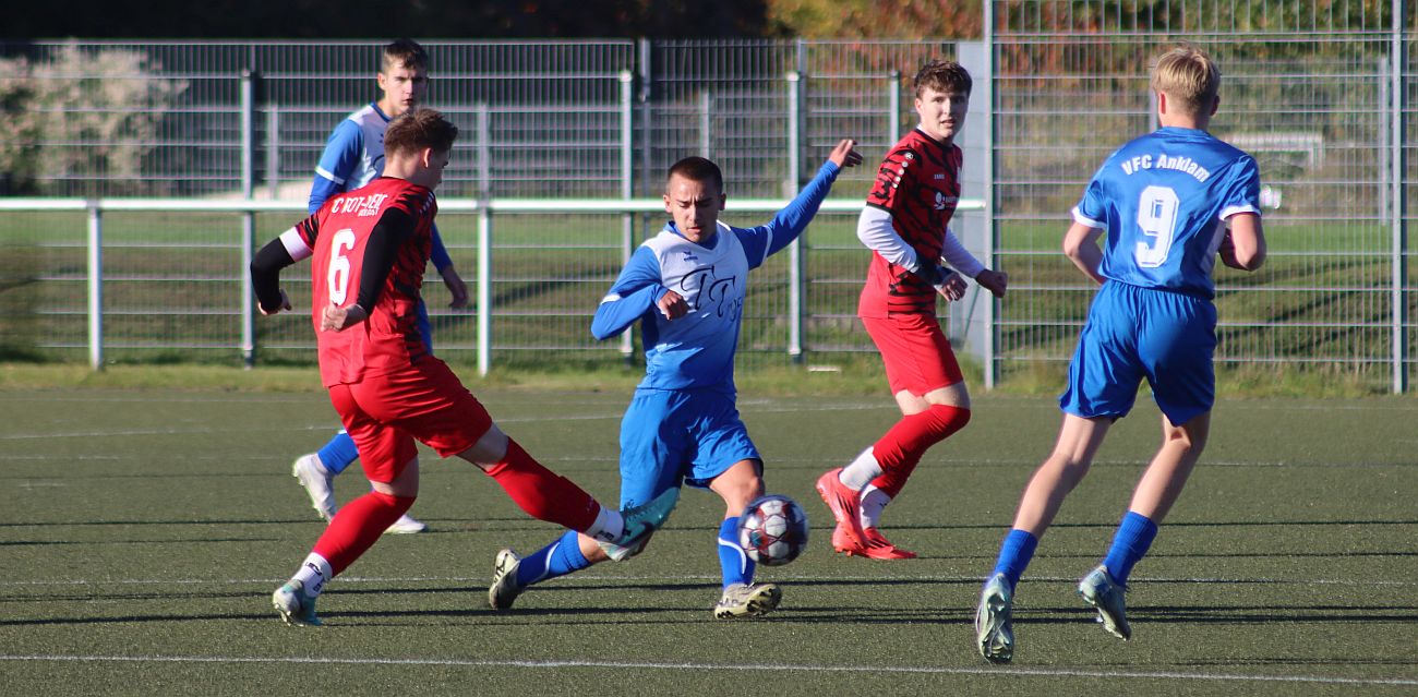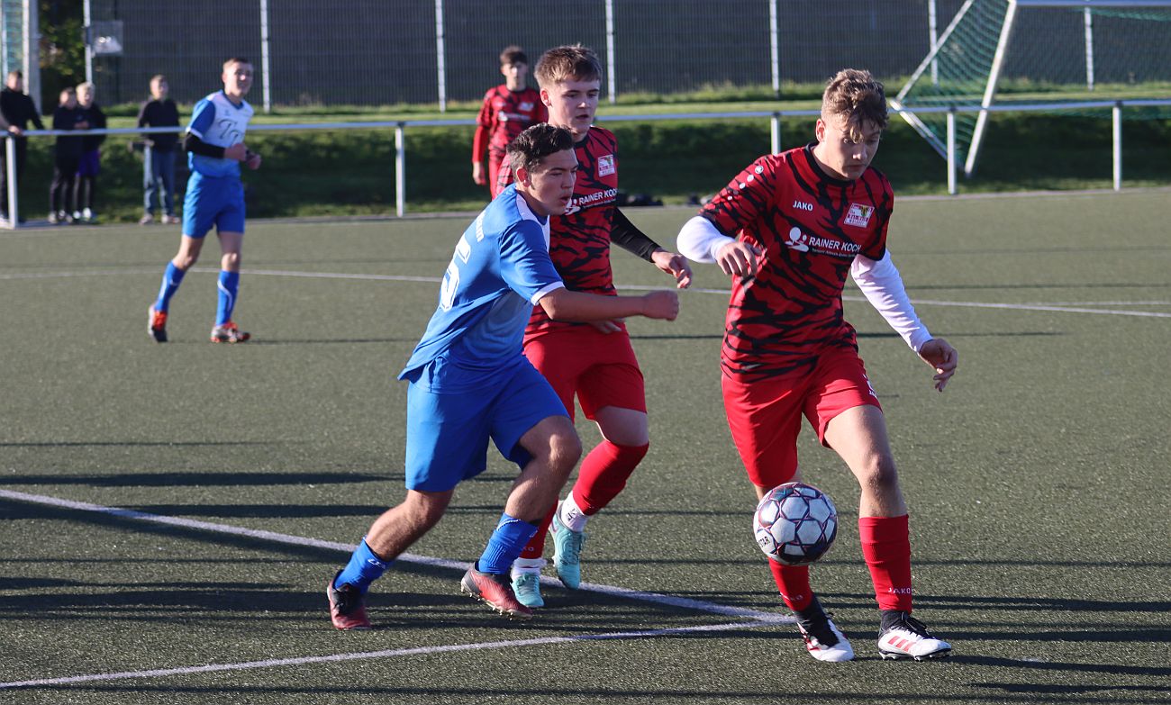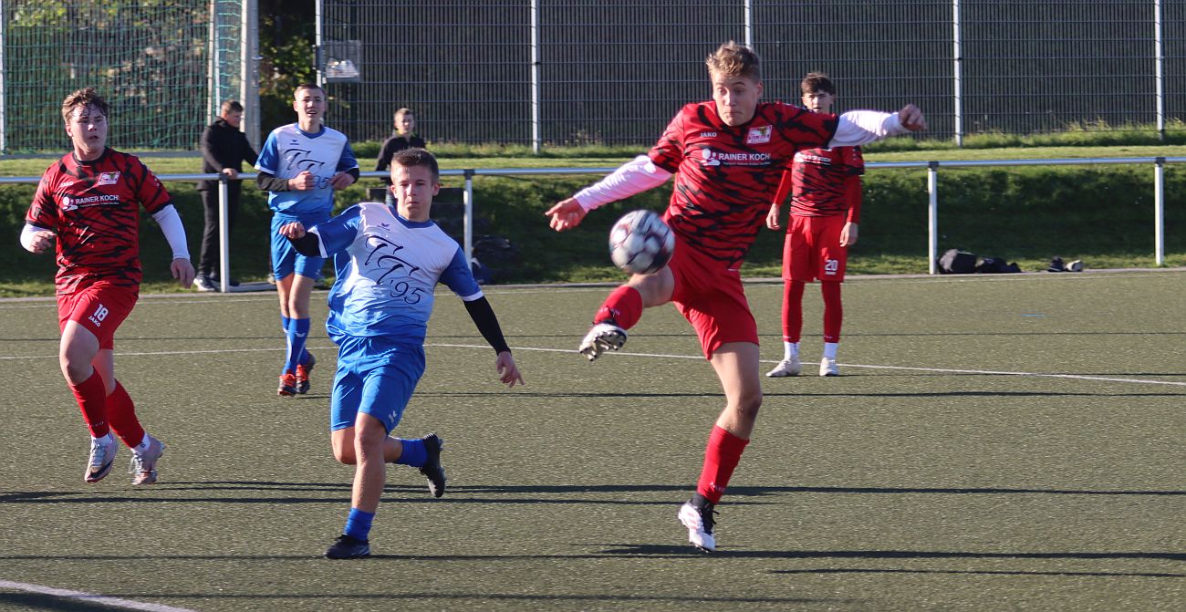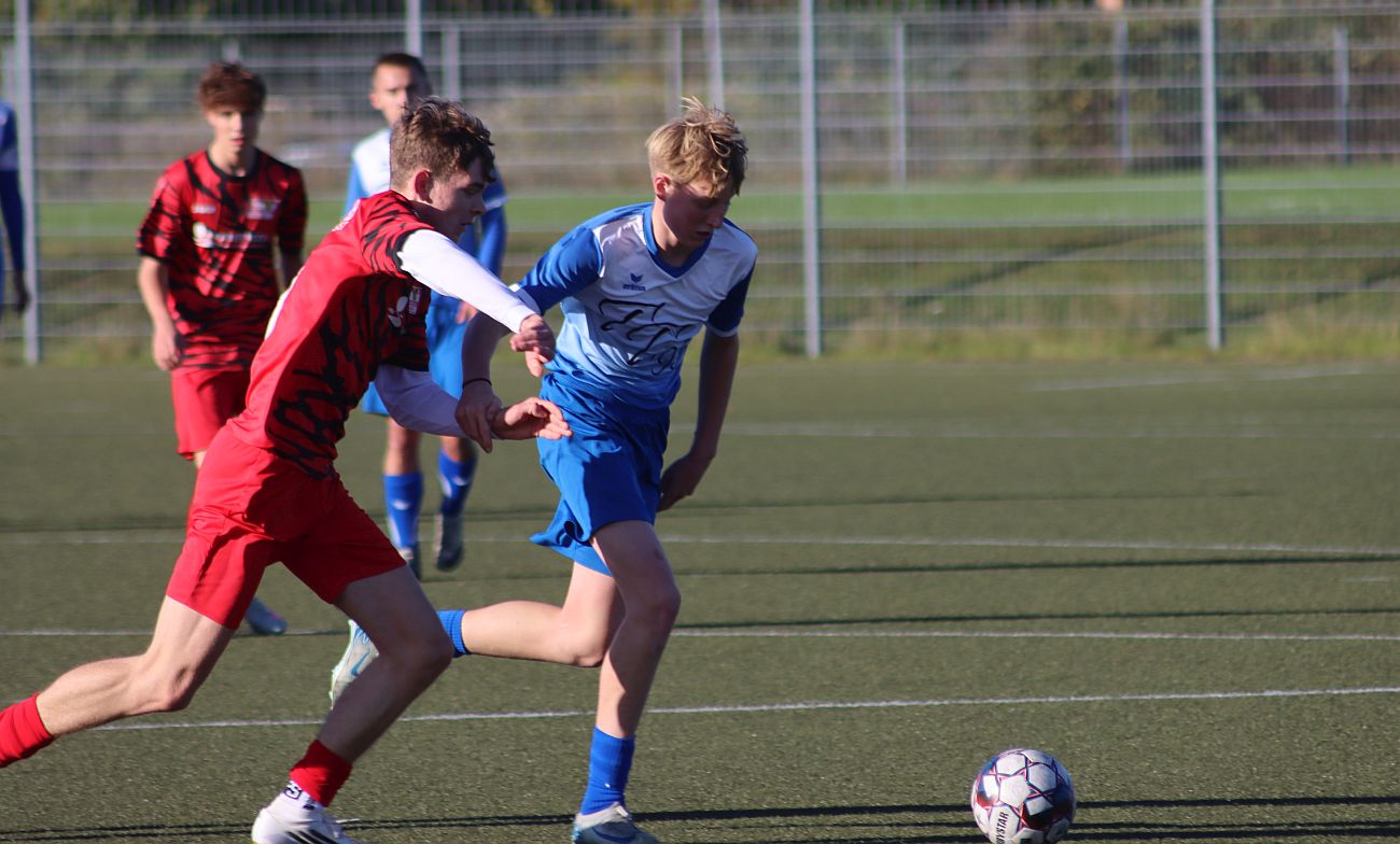 „Hut ab vor den elf Jungs, die heute auf dem Platz standen und diese starke Leistung gezeigt haben. Ohne Auswechselspieler haben sie alles gegeben, sich in jeden Zweikampf geworfen und bis zum Schluss gefightet“, lobte das Trainerduo Jan Winter und Maik Hoffmann nach dem Abpfiff. Dabei begann die Partie für unsere Nachwuchs-Kicker denkbar ungünstig: Bereits in der zweiten Spielminute gerieten sie aus stark abseitsverdächtiger Position mit 0:1 in Rückstand. Nach dem frühen Schock fanden sie jedoch immer besser ins Spiel, standen defensiv kompakt und setzten auch offensiv einige gute Akzente – der Ausgleich wollte bis zur Pause aber noch nicht fallen. Nach dem Seitenwechsel entwickelte sich ein ausgeglichenes Spiel, in dem die Gäste zunächst erneut zuschlugen und in der 57. Minute auf 0:2 erhöhten. Doch unsere Jungs zeigten Charakter. Kapitän John Brasch brachte sein Team in der 64. Minute mit einem direkt verwandelten Freistoß aus rund 30 Metern zurück ins Spiel. Nur zwei Minuten später übernahm er erneut Verantwortung und verwandelte einen fälligen Handelfmeter sicher zum 2:2-Ausgleich.