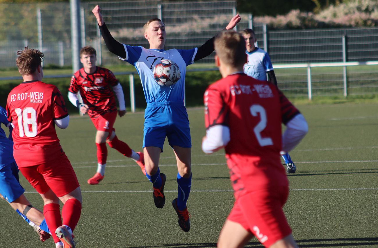Große Moral zeigten unsere B-Junioren gestern im Landesliga-Duell gegen den FC Rot-Weiß Wolgast. Trotz einer angespannten Personalsituation – lediglich elf einsatzfähige Spieler standen zur Verfügung – erkämpfte sich das Team im heimischen Stadion nach einem 0:2-Rückstand noch ein verdientes 2:2 (0:1)-Unentschieden.